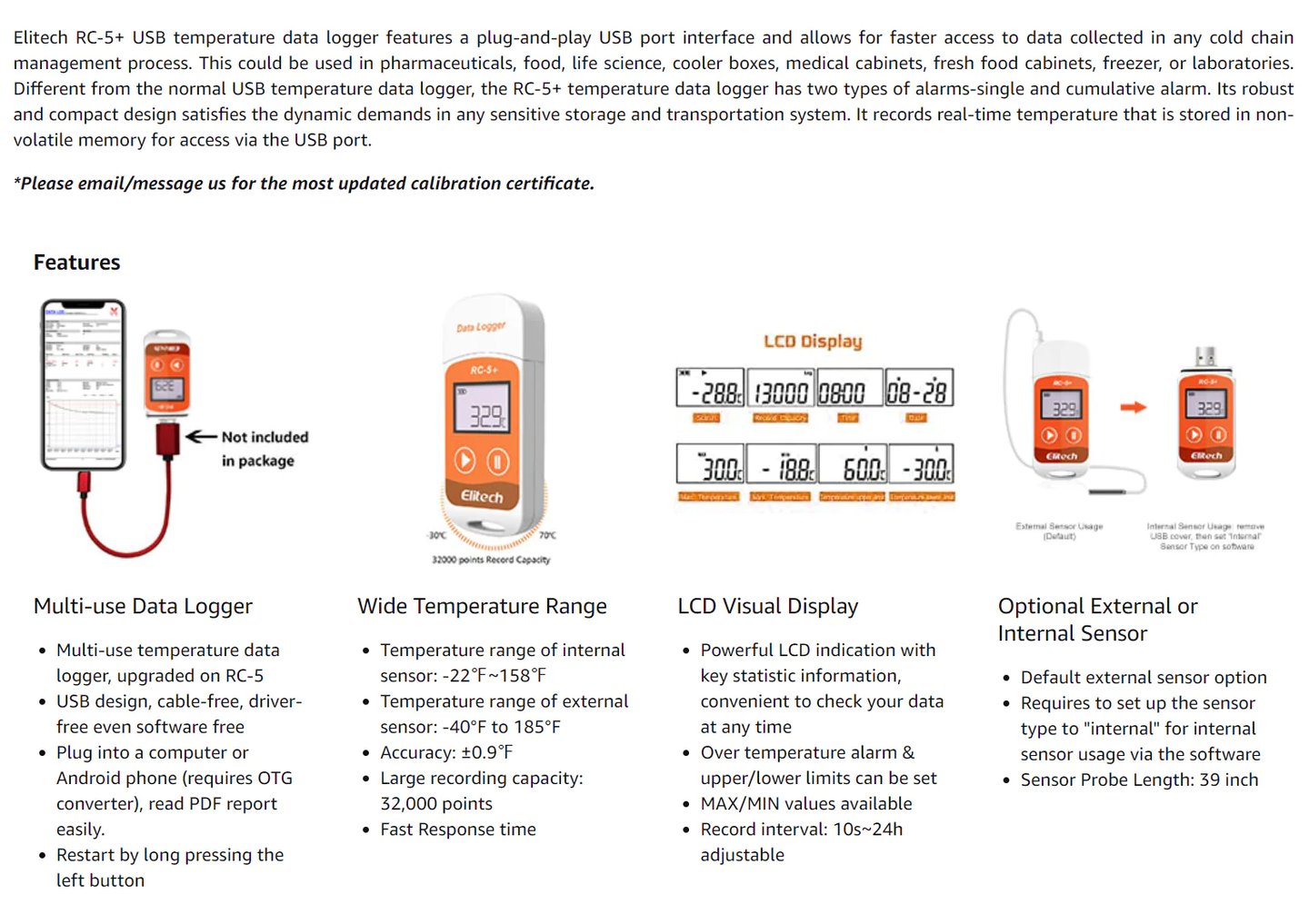 · Elitech RC-5 + USB temperature recorder, automatically generates PD reports.