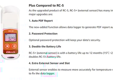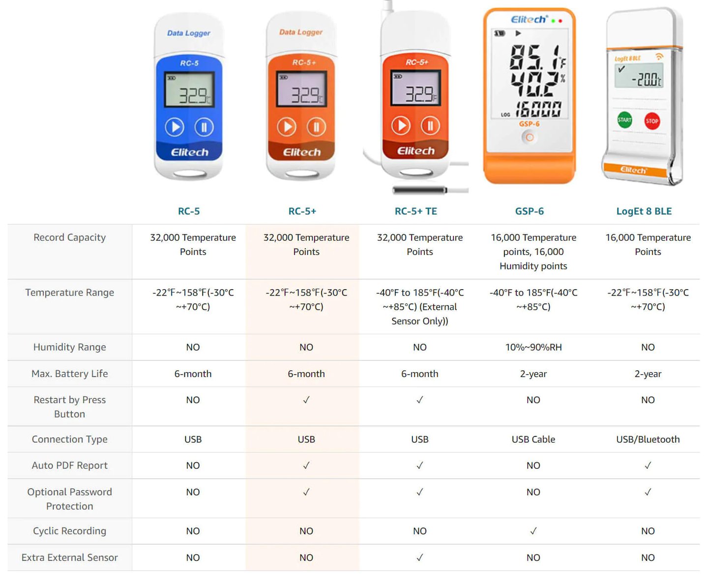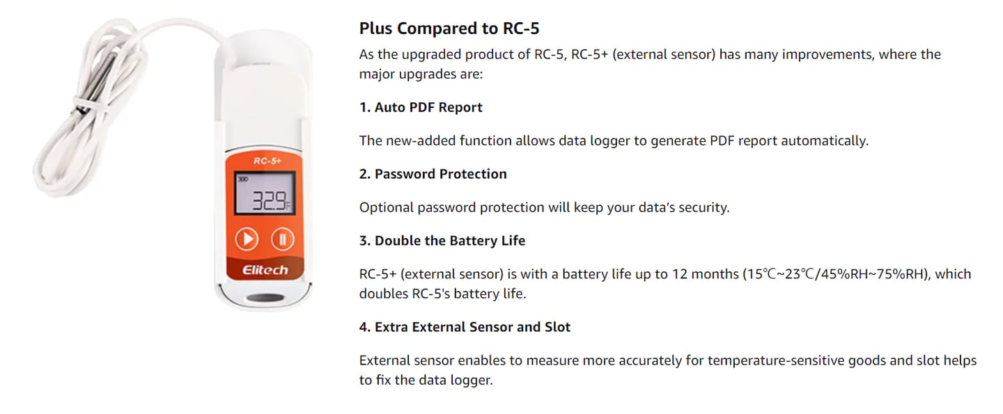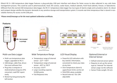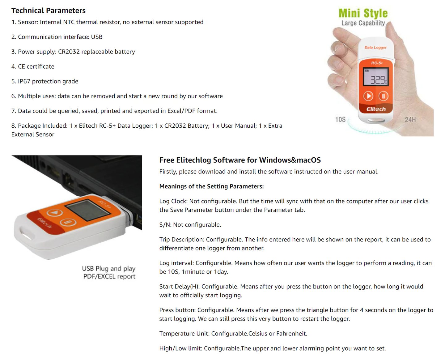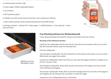 For convenience and reliability, Elitech USB temperature data logger supports Via button, immediate start, timing start, support for multiple start and stop, support replaceable batteries, optional external probe, optional mounting bracket, protection Rating (IP67).